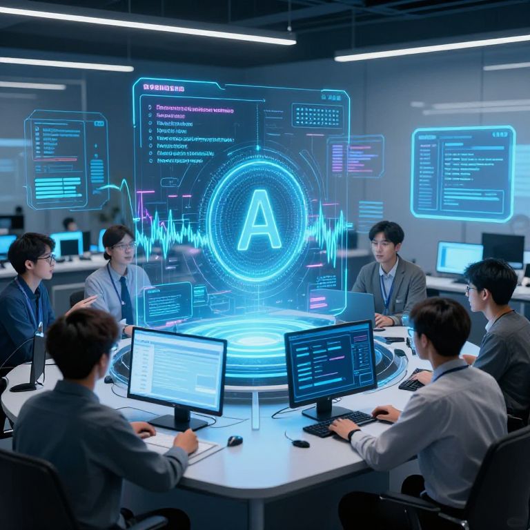 Photograph of a high-tech conference room featuring six Asian men in business attire, seated around a white table with multiple computer monitors. The background has futuristic blue holographic displays showing data and a glowing "A" at the center. The men, with short black hair, are focused on screens displaying code and graphs. The room is illuminated by bright white fluorescent lights, and the holographic interface is surrounded by neon blue lines and text. The atmosphere is modern and tech-savvy, emphasizing data analysis and collaboration.