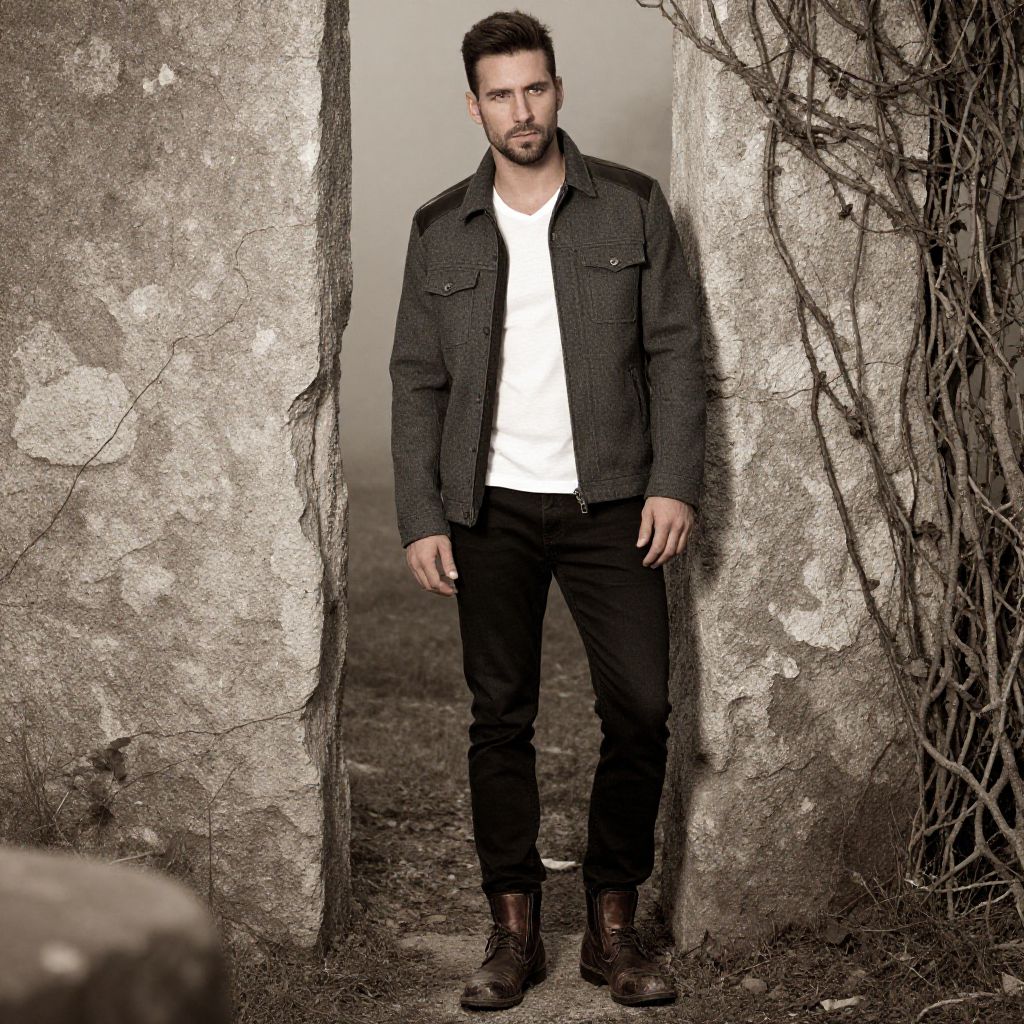 A man, charcoal gray flannel jacket, leather shoulder accents, white crew neck t-shirt, slim-fit black jeans, distressed leather chukka boots, crumbled stone pillars, overgrown vines, misty morning light, contemplative expression, sepia effect. Man has masculine face and piercing eyes