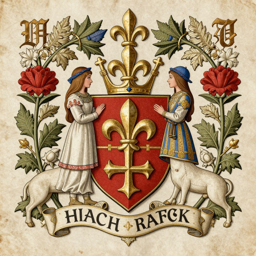 How to make a family crest, concept art of a family gathering around a large parchment drawing their unique crest with symbolic animals and emblems, vibrant colors, historical setting, detailed and elegant decorative borders