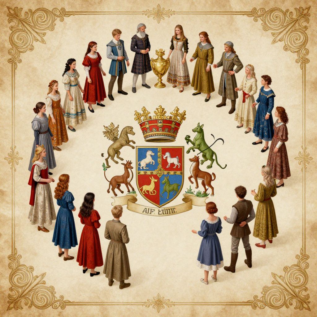Digital illustration of medieval-style family crest surrounded by 16 characters in period attire, featuring horses, a crown, and coat of arms.