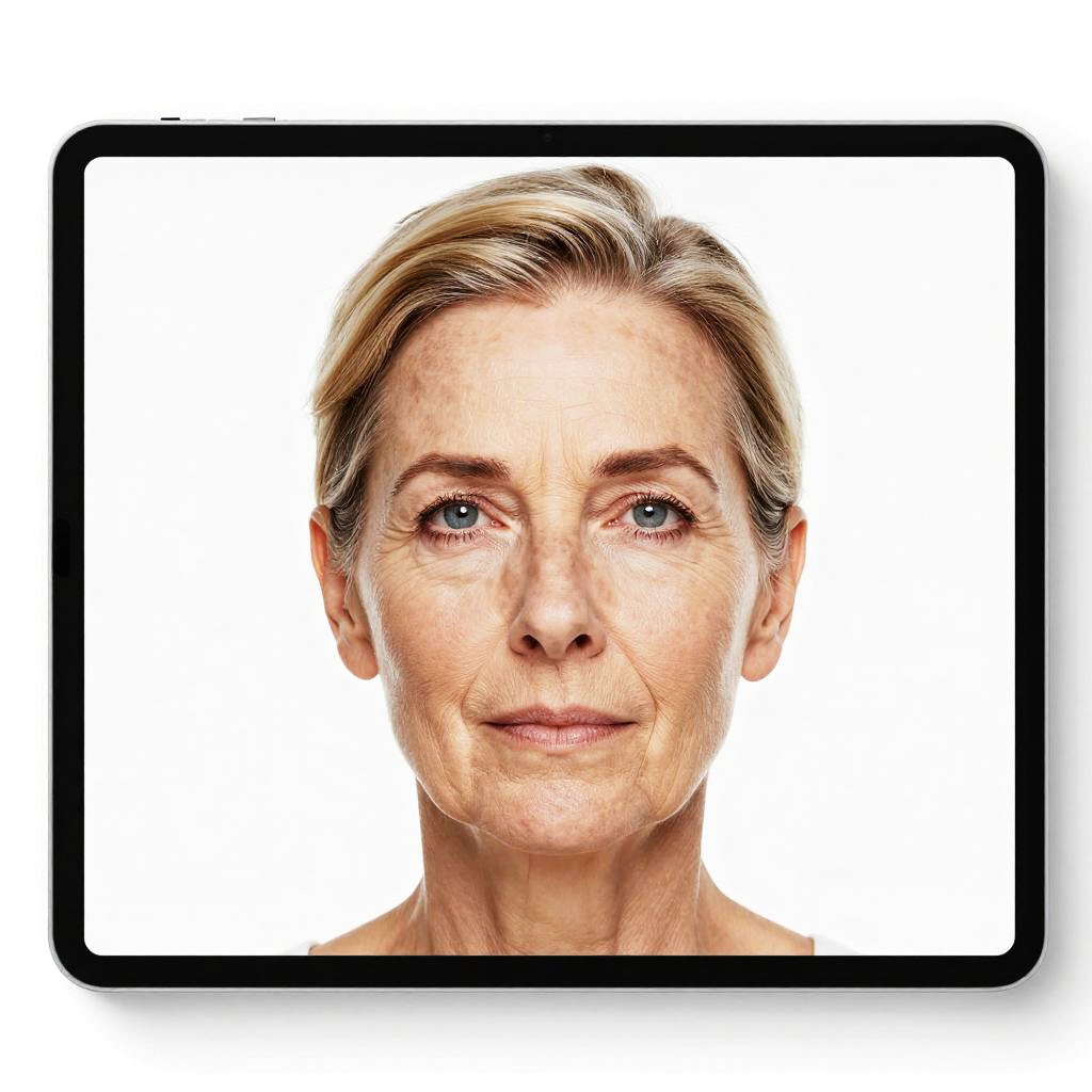 Age my face online free visualization on a tablet screen, showing real-time aging effects on a middle-aged individual’s face, clean and minimalistic UI, subtle lighting, photorealistic rendering, showcasing features like sagging skin and fine lines.