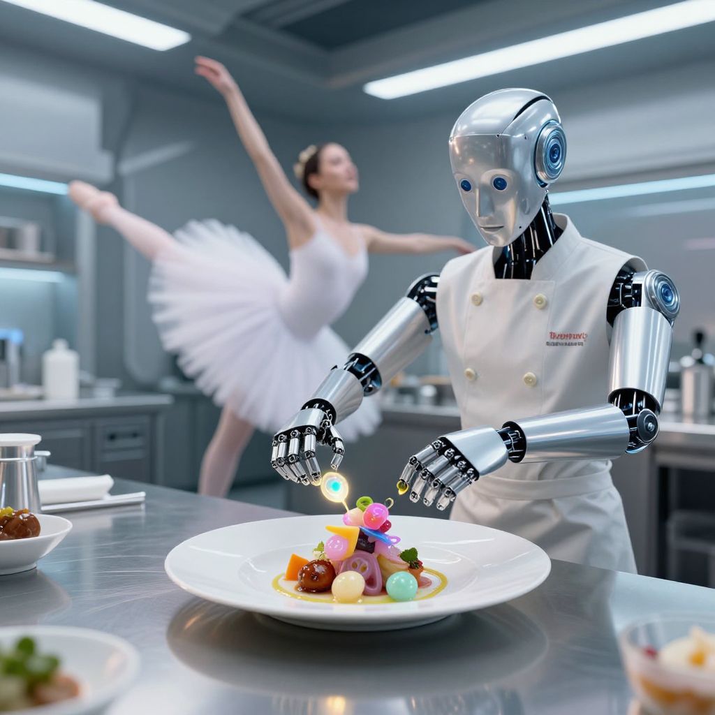 Photograph of a futuristic kitchen: a silver robot chef with glowing eyes prepares colorful dessert, while a ballerina in a white tutu dances in