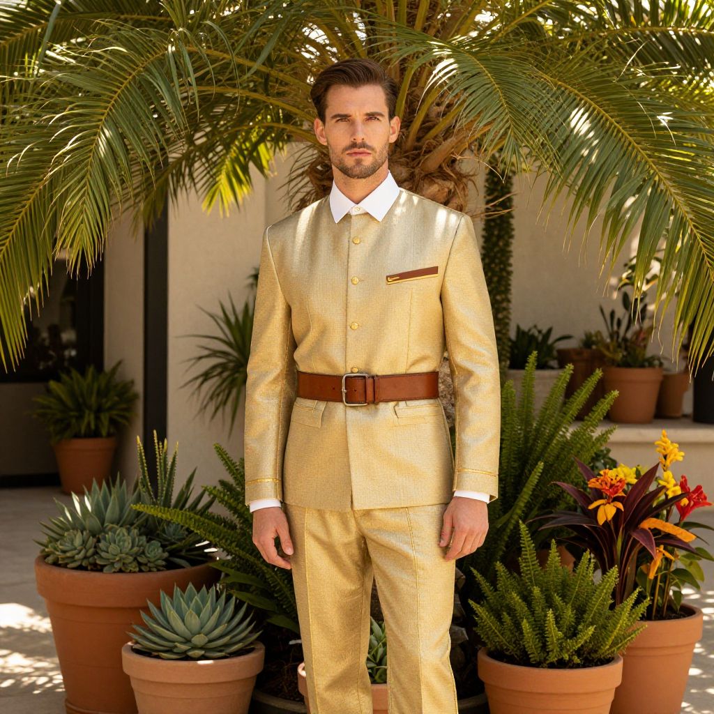 A man with short brown hair and a well-groomed facial appearance stands confidently in front of a tall, lush palm tree, wearing a stylish gold outfit featuring a crisp white collar and a brown leather belt. He is dressed in a tailored, modern suit with subtle gold accents, giving him a sophisticated and elegant look. The scene is set in a sunny, tropical outdoor environment, with vibrant potted plants of various types—such as succulents, ferns, and tropical flowers—arranged in the background, adding color and life to the setting. The warm golden light filters through the leaves, casting soft shadows and highlighting the textures of the clothing and the greenery. The atmosphere is peaceful and inviting, blending natural beauty with a touch of refined urban or coastal elegance.