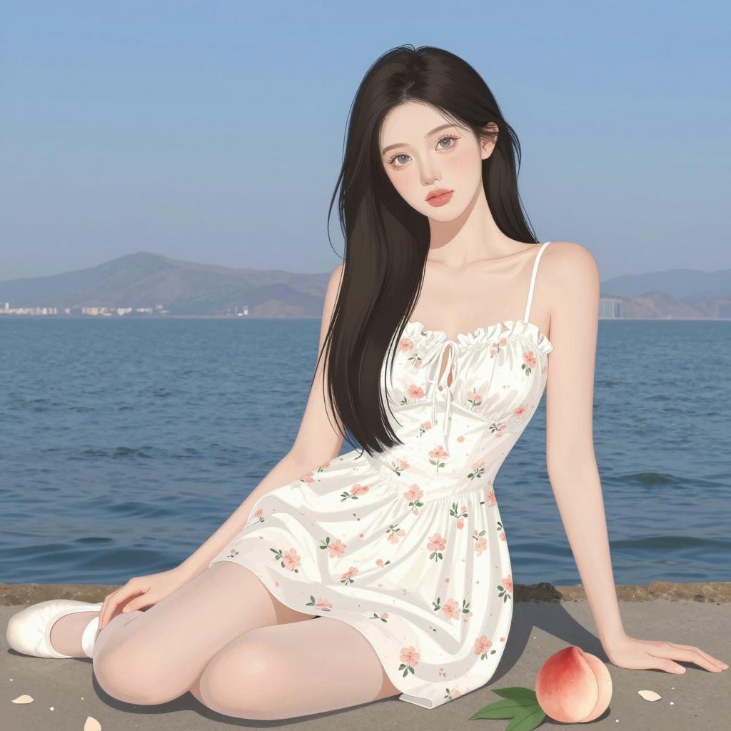 Digital illustration of a petite woman with long straight black hair and light grey eyes sitting on the ground by the water. She is dressed in a white floral print dress with spaghetti straps, nude tights, and white ballet flats. The background features a clear sky blue day with distant mountains and scattered peach fruits and petals around her.