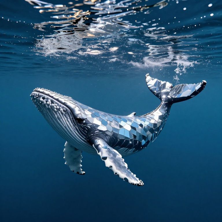Photograph of a massive blue whale underwater, illuminated by sunlight, showcasing its detailed, textured skin and flippers against a deep blue ocean background.