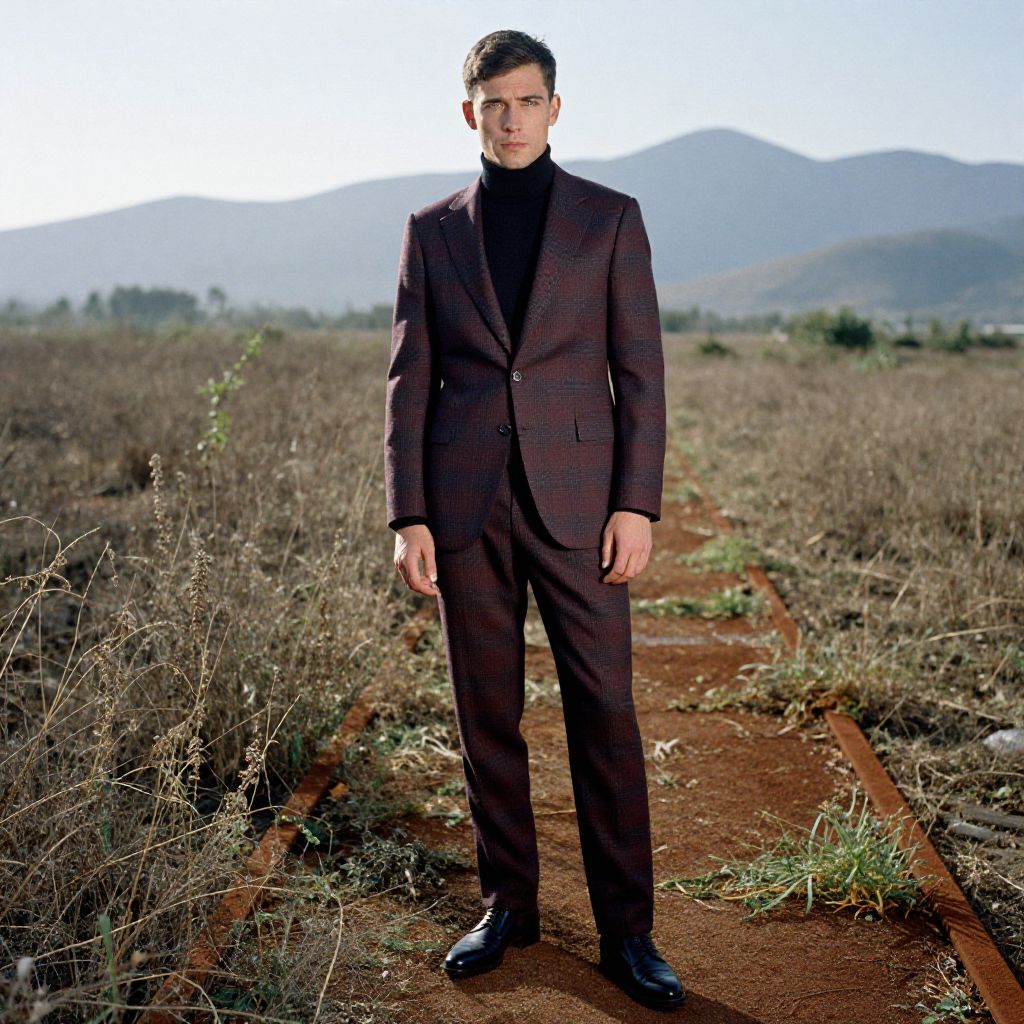 A man, burgundy and charcoal plaid suit, textured wool blend, fitted black turtleneck, sleek black oxford shoes, rusty tracks glinting in the sun, overgrown weeds, distant mountains silhouetted, 3M ferrania analog film stock, contemplative expression. Man has masculine face and piercing eyes