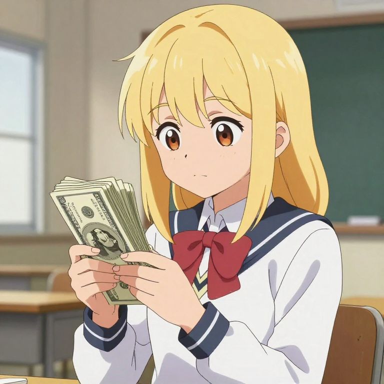 A manga-style 11-year-old girl with blonde hair, wearing a school uniform, holds and counts stacks of money.