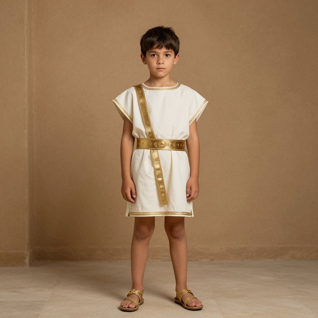 Photograph of a young boy with short, dark hair, standing against a plain, beige wall and light-colored floor. He wears a white, short-sleeved tunic with gold trim and a gold belt, and brown sandals. His expression is neutral, and he stands with his arms relaxed by his sides. The tunic has a simple, ancient Greek-inspired design. The lighting is even, highlighting the textures of the tunic and the smoothness of the floor. The background is minimal, drawing focus to the boy and his attire.