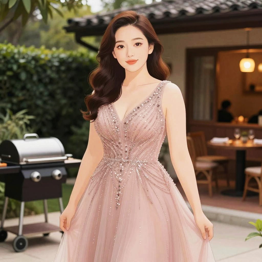A Curvy woman, in a formal sleeveless A-line gown of blush pink with a V-neckline and shimmering beadwork, stands gracefully at a Hibachi Grill in a Private Backyard, surrounded by lush greenery and warm ambient lighting, her soft waves cascading elegantly over her shoulders, illustrated in the style of nbm graphic novels. Sexy. Pretty face and beutiful eyes