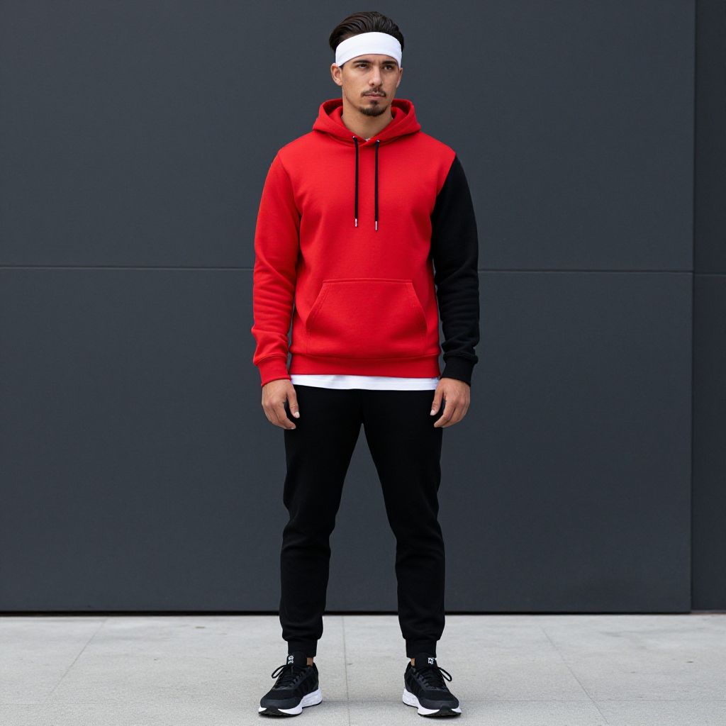 "Casual Sporty Outfit Man, man in a red and black hoodie and a white headband"