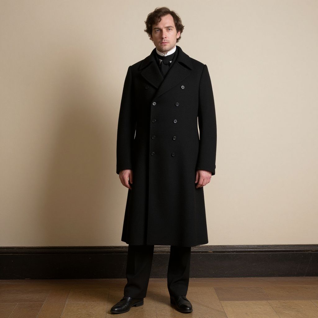 "Victorian Cutaway Coat, image of a man in a black coat standing in front of a wall"