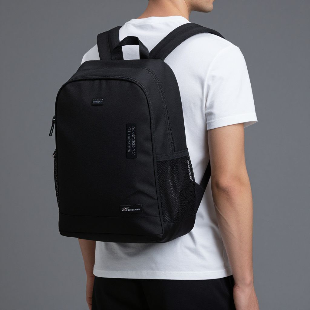 Photograph of a young man standing in a minimalist studio with a plain white and light gray background. He faces away but looks over his right shoulder. He wears a white long-sleeved button-up shirt, black pants, white sneakers with black stripes, and a large black backpack with multiple pockets. His short black hair is neatly styled. The image is well-lit with soft shadows, highlighting the clean, modern, and simple style of his outfit. The overall composition is centered, emphasizing the contrast between his white shirt and black backpack.