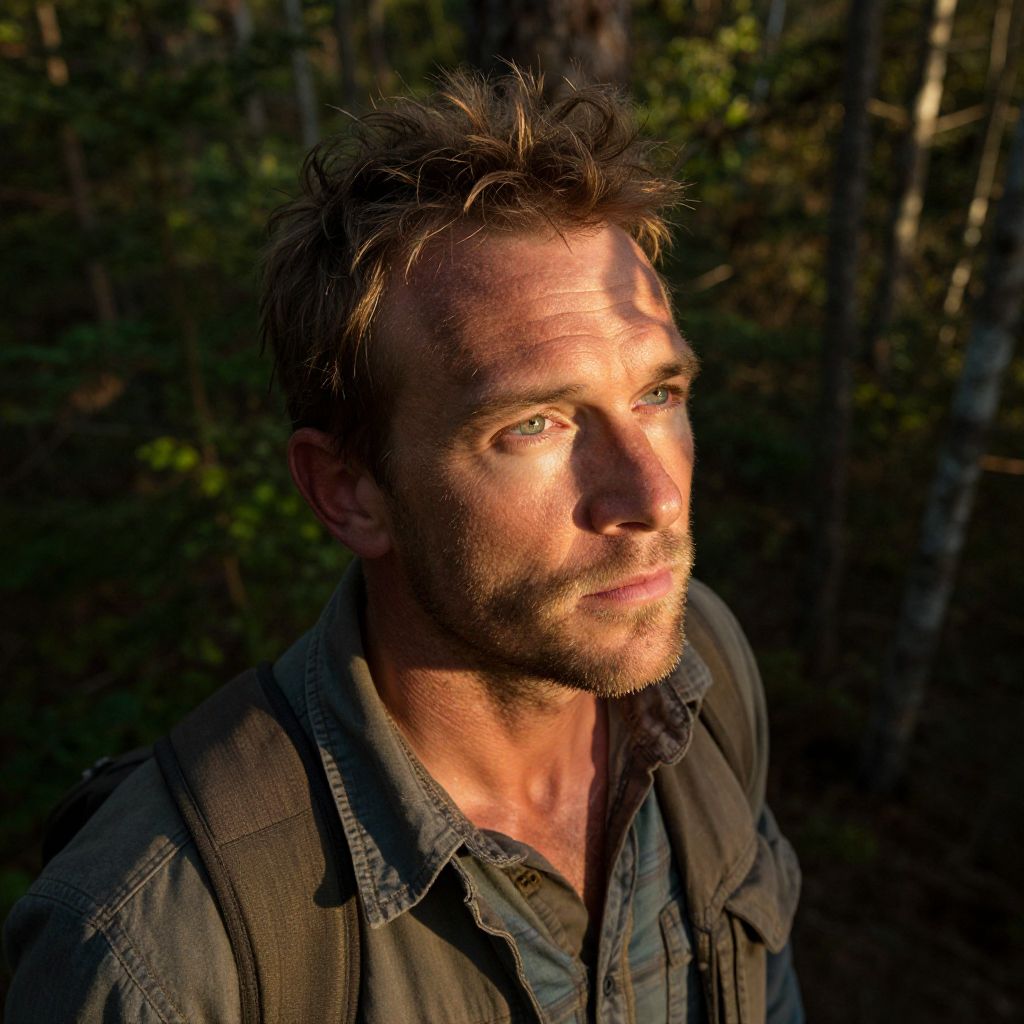 A captivating portrait of a rugged outdoorsman with soft, green eyes and sun-kissed skin emerges from the dramatic backdrop of an untamed forest. This solitary figure, lost in deep thought, gazes into the horizon as golden sunlight filters through dense foliage, casting intricate patterns on his weathered face. Viewed from an unusual aerial perspective above and slightly behind him, the photorealistic rendering showcases the interplay of light and shadow, emphasizing the rugged beauty of nature and the stoic resilience etched in the lines of his countenance.