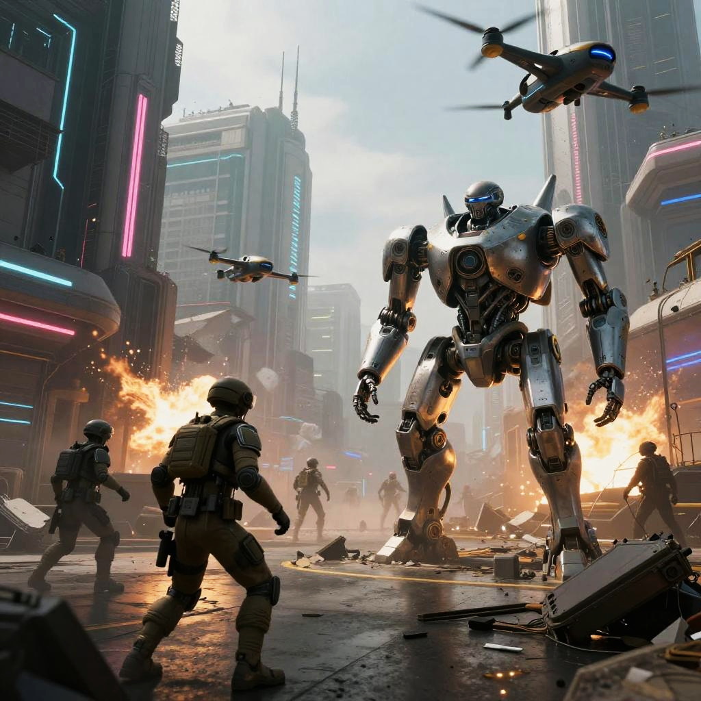 War inspired futuristic combat zone featuring robotic soldiers and drones amidst shattered high-tech buildings, neon lighting, haze from explosions, cyberpunk vibe with detailed mechanical designs and a cinematic viewpoint.