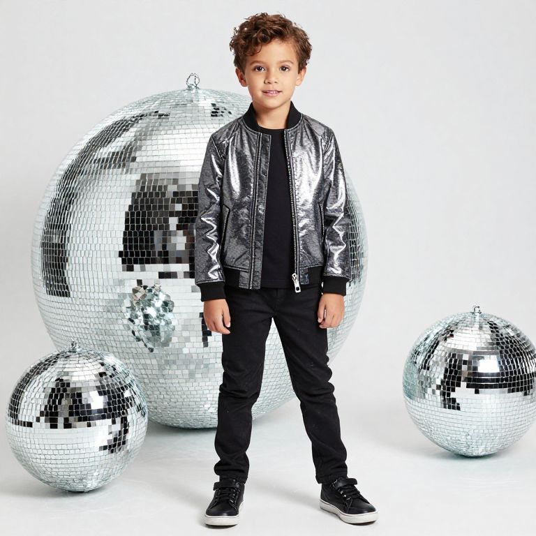 Disco Theme Outfit For Boy, boy in a shiny jacket standing in front of a disco ball