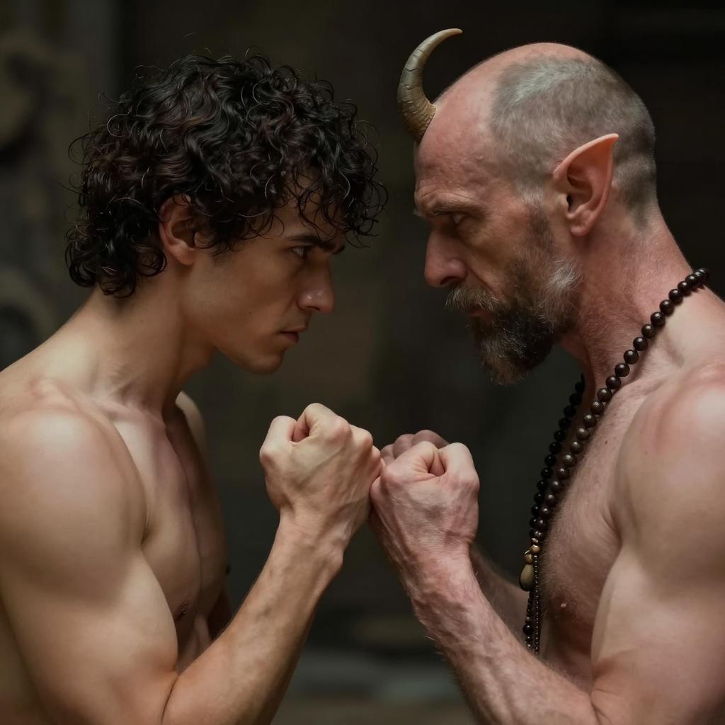 Two shirtless men in a dimly lit setting. The man on the left has dark, curly hair, a serious expression, and clenched fists. The man on the right has baldness with a small horn on the forehead, pointed ears, and a beard. Both men are leaning towards each other, eyes locked. The right man has a necklace with dark beads.