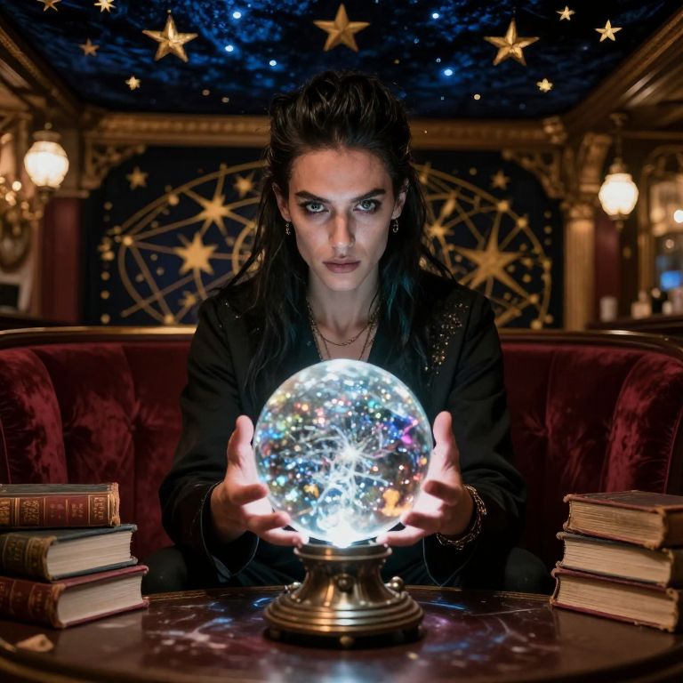 An enigmatic crystal ball mystic with sharp cheekbones, a high forehead, and a knowing gaze sits on a velvet-chaise in a magically themed vintage lounge; the room features velvet stars embedded in the ceiling, golden star charts, and dusty vintage books, with the crystal ball floating slightly above her hands, radiating a shimmering arcane energy