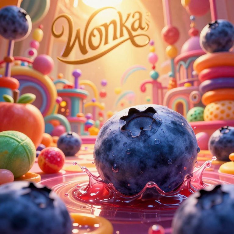 Willy Wonka blueberry scene, hyper-realistic depiction of blueberry inflation moment with oversized round blueberry, colorful candy factory details, whimsical machinery, bright lighting, surreal fantasy environment with rich textures and vivid colors