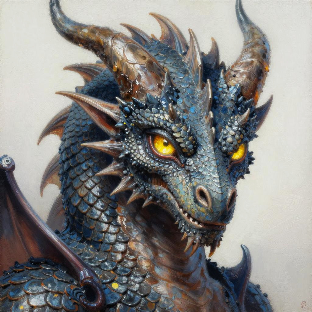 Impasto, anthro, male, ((detailed scales)), ((looking pleasured)), detailed realistic painting, solo, (shaded) extreme detail, bright eye, ((dragon)), horns, ((slit pupils)), (fins), (detailed realistic painting), headshot portrait, looking at viewer, glowing eyes, yellow eyes, high light, (realistic), 85mm
