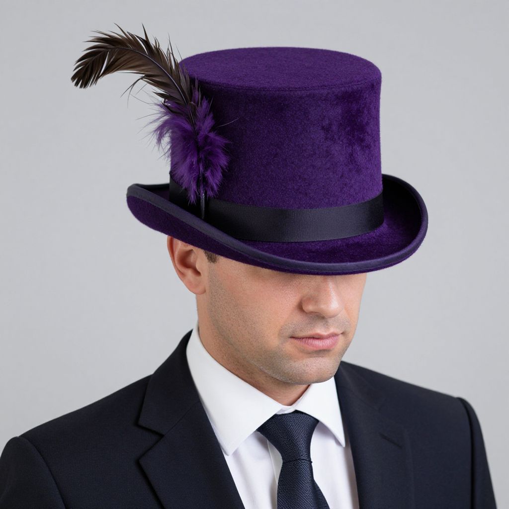 Purple Pimp Hat Feather, man in a suit and tie with a purple top hat