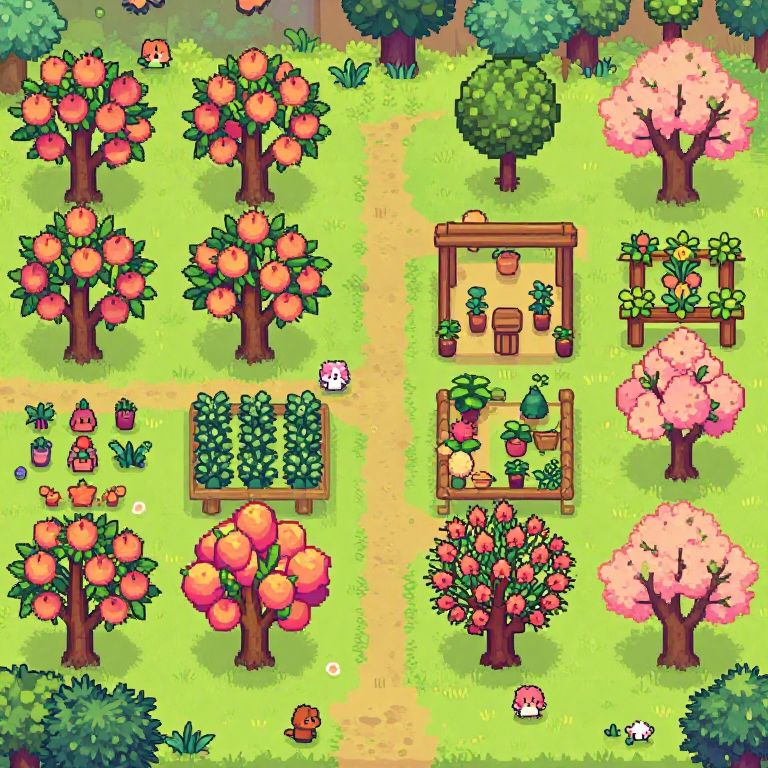 Peach Stardew botanical garden with various peach trees, lush greenery, and small woodland creatures in a pixel art style, soft pastel colors blending with natural light, creating a serene and magical farming game atmosphere.