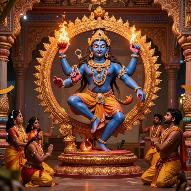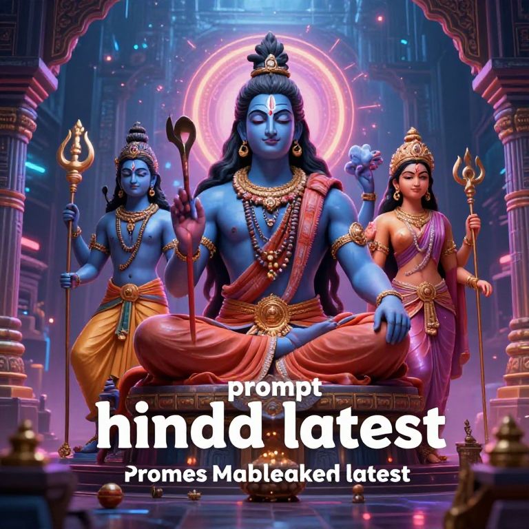 An artist blending digital art with Hindu mythology, depicting the latest interpretations of deities like Shiva and Lakshmi in a futuristic temple setting with neon lights and spiritual energy. The keyword: prompt hindu latest.