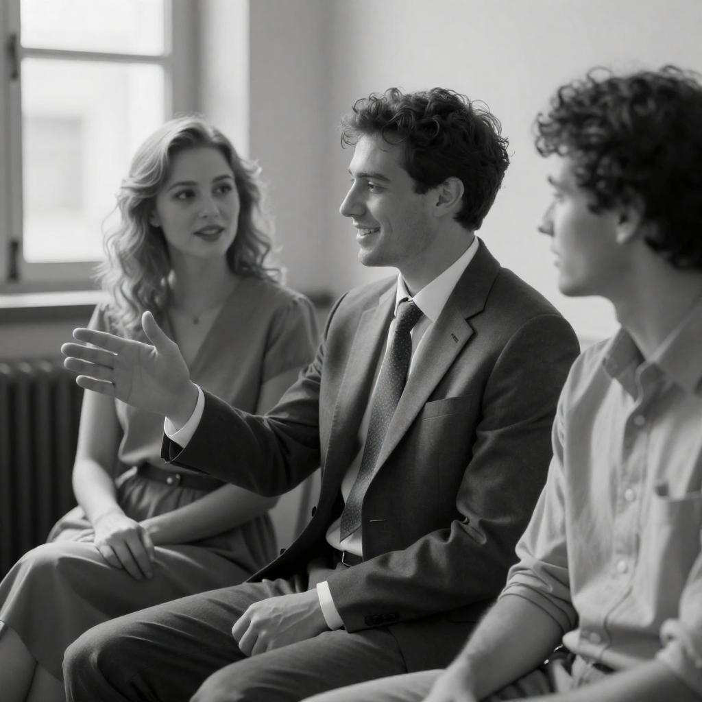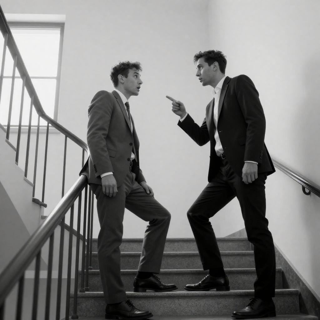 Black-and-white photograph of a man with dark hair in a ured suit, standing and facing a young boy with light, curly hair, wearing a striped shirt. They are indoors, with a blurred background of shelves and equipment. The man gestures with his right hand, while the boy looks up at him.