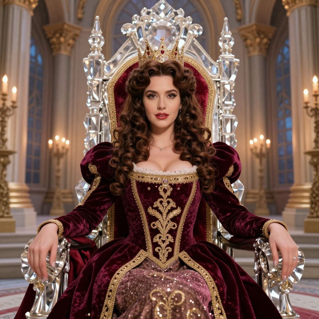 A glamorous woman in a royal-themed fanciful costume featuring a rich brown curly wig and a luxurious velvet dress with gold embroidery, seated on a throne made of crystal and red velvet in a fantasy palace with towering pillars and candlelit windows; she has high cheekbones, fair skin, and a regal expression with a crown on her head. The woman has big tits and cute face