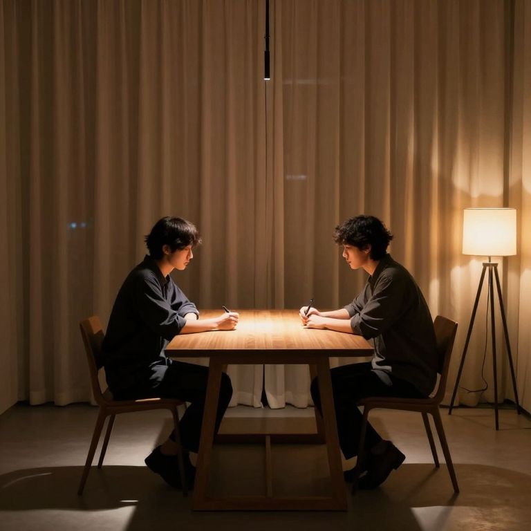 Two individuals sit at a wooden table illuminated by a focused spotlight, surrounded by warm-toned curtains and a tripod lamp, showcasing a minimalist yet dramatic lighting setup by Chris May.