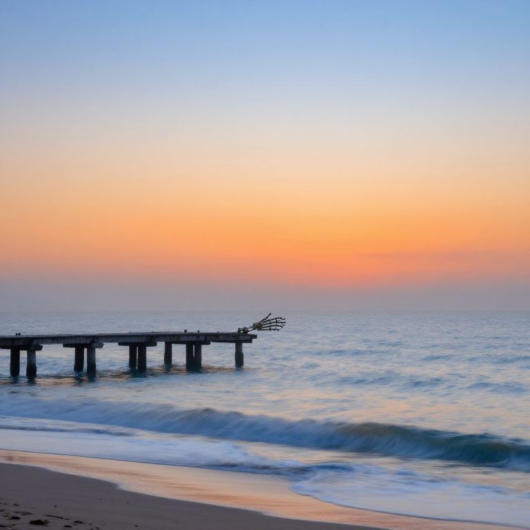 Imagine a surreal seascape painting capturing a tranquil ocean scene with gentle waves lapping at the shore, reminiscent of Monet's ethereal approach to nature. The horizon gracefully shifts from an enchanting misty blue to vibrant orange as the sun sets behind the viewer, creating a mesmerizing gradient that evokes a sense of peace and wonder. In the foreground, an ancient, weathered pier stretches out over the water like a skeletal hand reaching for the heavens, offering both intrigue and nostalgia. This unique perspective draws the observer into a dreamscape where nature and art intertwine in a captivating dance of color and light.