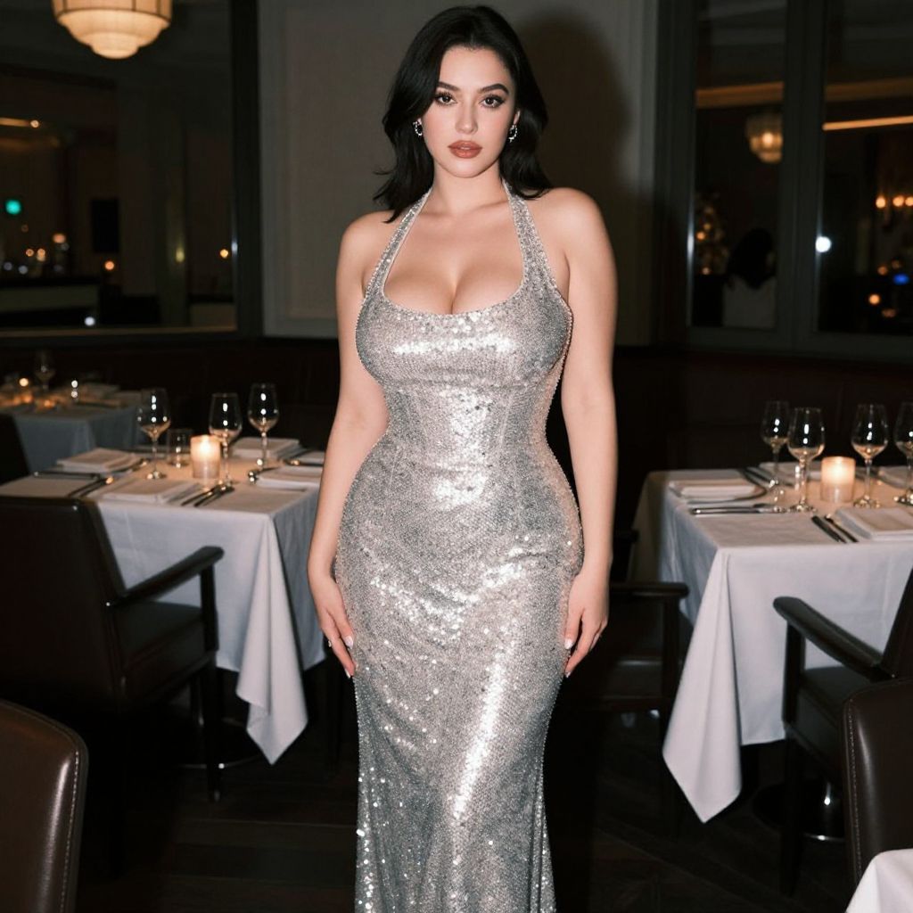 Photograph of a curvy woman with light skin and black shoulder-length hair standing in a dimly lit restaurant. She wears a form-fitting, sparkling silver sequin halter dress that accentuates her large breasts and hourglass figure. Her makeup is bold with dark red lipstick. The background features white tablecloths, lit candles, and empty wine glasses on dark wooden tables. A chandelier hangs from the ceiling, and the restaurant has dark walls with large windows reflecting light. Her confident pose and direct gaze add to the glamorous and elegant atmosphere.
