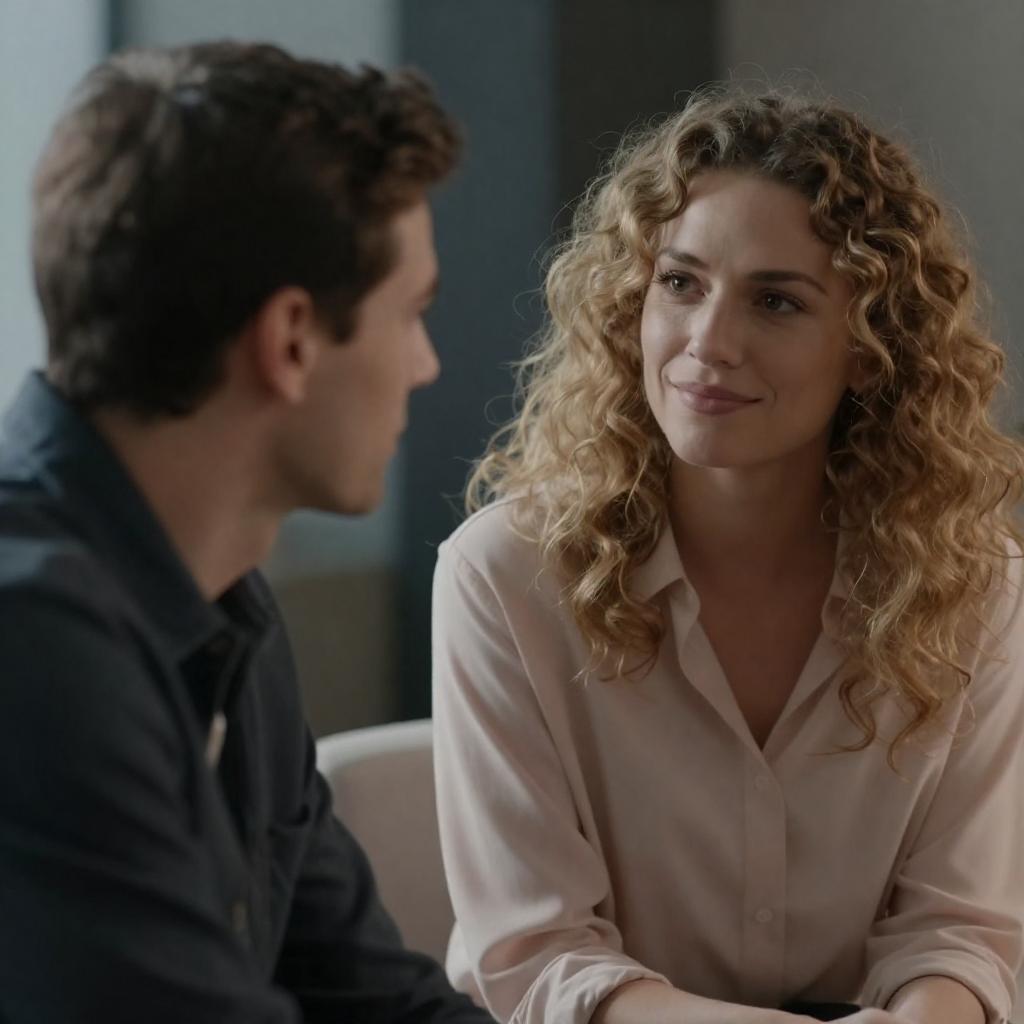 Photograph of a smiling woman with short, curly blonde hair, wearing a dark patterned blouse, seated in a dimly lit room with warm, yellow-toned lamps in the background. She is engaged in conversation with a partially visible person on the right. The scene has a cozy, intimate atmosphere.
