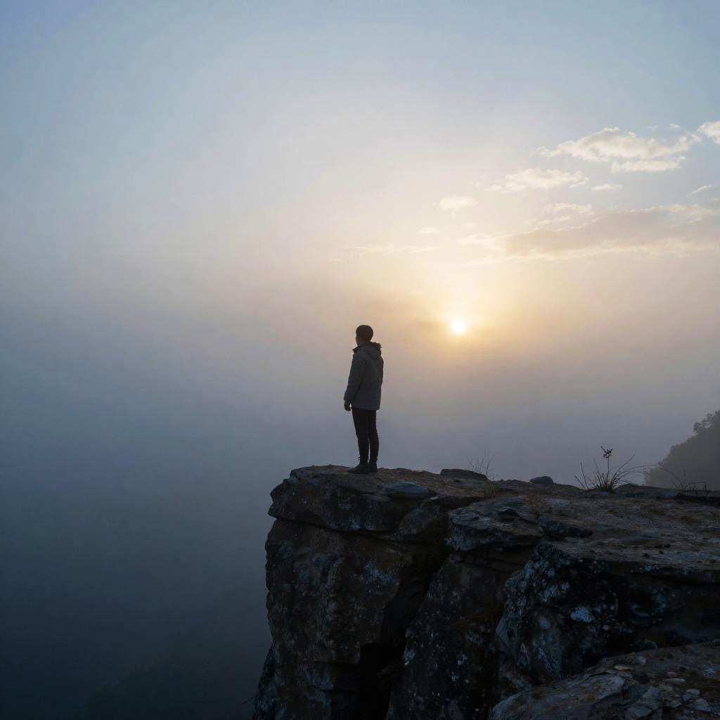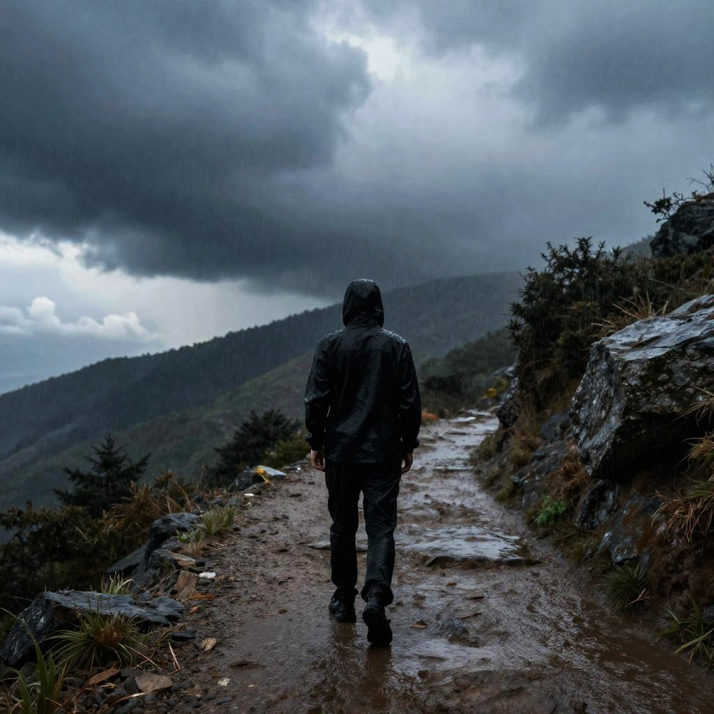 A silhouette of a person standing in the rain on a mountain path, heavy rain clouds rolling overhead, distant thunderstorm creating dramatic lighting, wild landscape of rocks and trees blurred by rain, focused on texture of water pouring and soaked clothing.