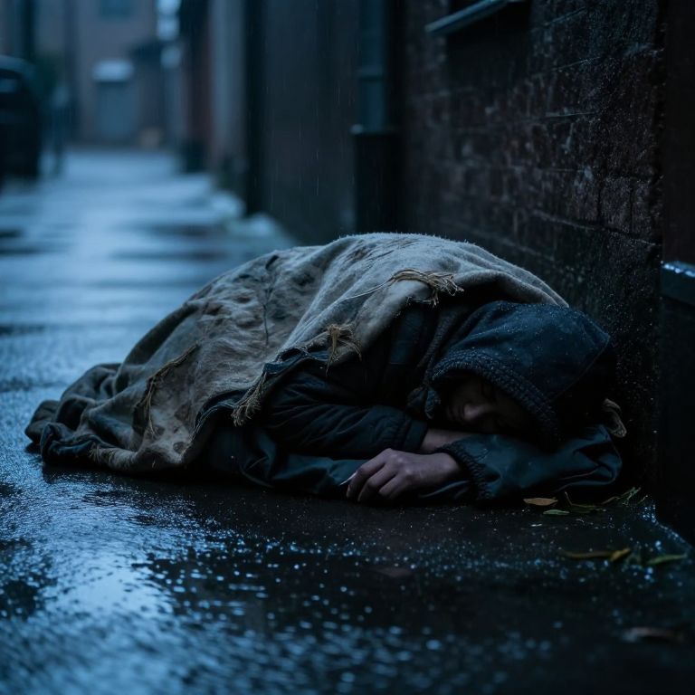 Obdachlose sleeping under a tattered blanket in a dimly lit alley, rain falling softly, reflections on wet pavement, moody and atmospheric scene with cold color palette, high detail on textures of clothing and surrounding environment.