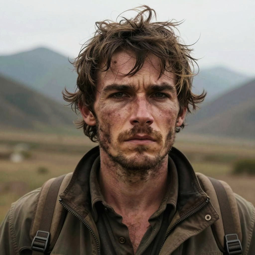 Hunter eyes eyebrows rugged and bold, survivalist in wilderness, gritty realism, wind-swept hair, blurred background of mountains, strong emotional expression, natural palette