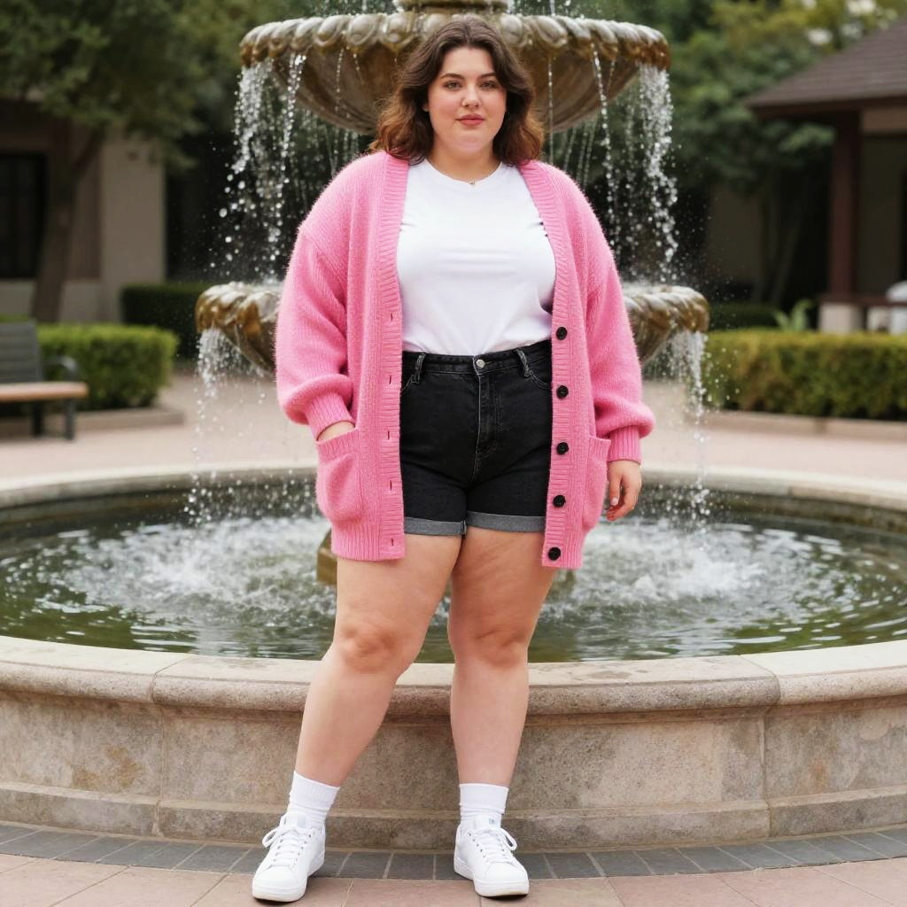 A lanky woman in casual streetwear, wearing a bright pink oversized cardigan over a white t-shirt and high-waisted black denim shorts, paired with classic white sneakers and socks, set beside a garden water fountain in a seven seas visual style. Sexy. Pretty face and beutiful eyes