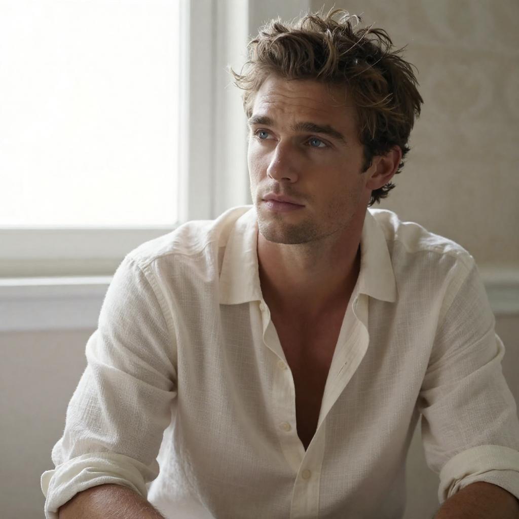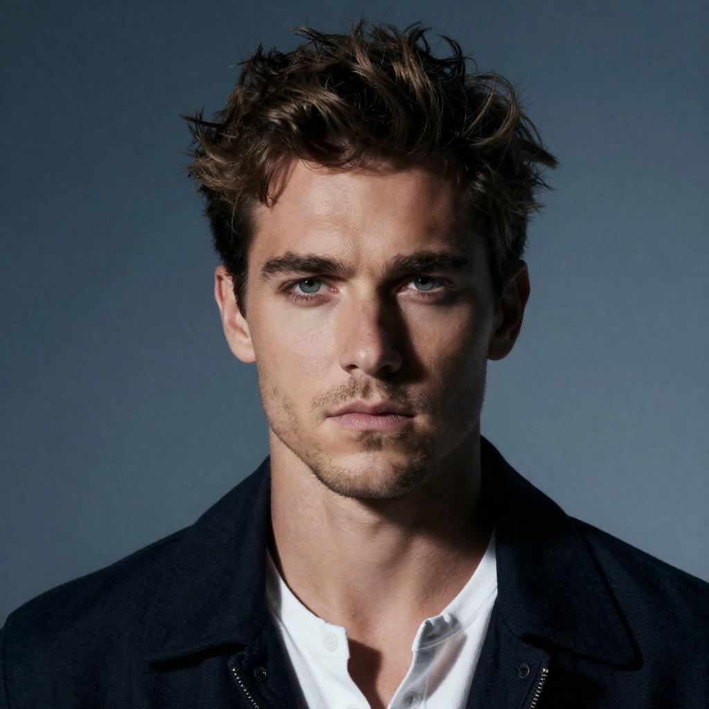 Photograph of a handsome man with tousled brown hair and a serious expression. He has a strong jawline, light stubble, and piercing eyes. His face is split by a bright light source, casting a stark contrast. He wears a dark jacket over a white shirt. The background is a gradient of blue.