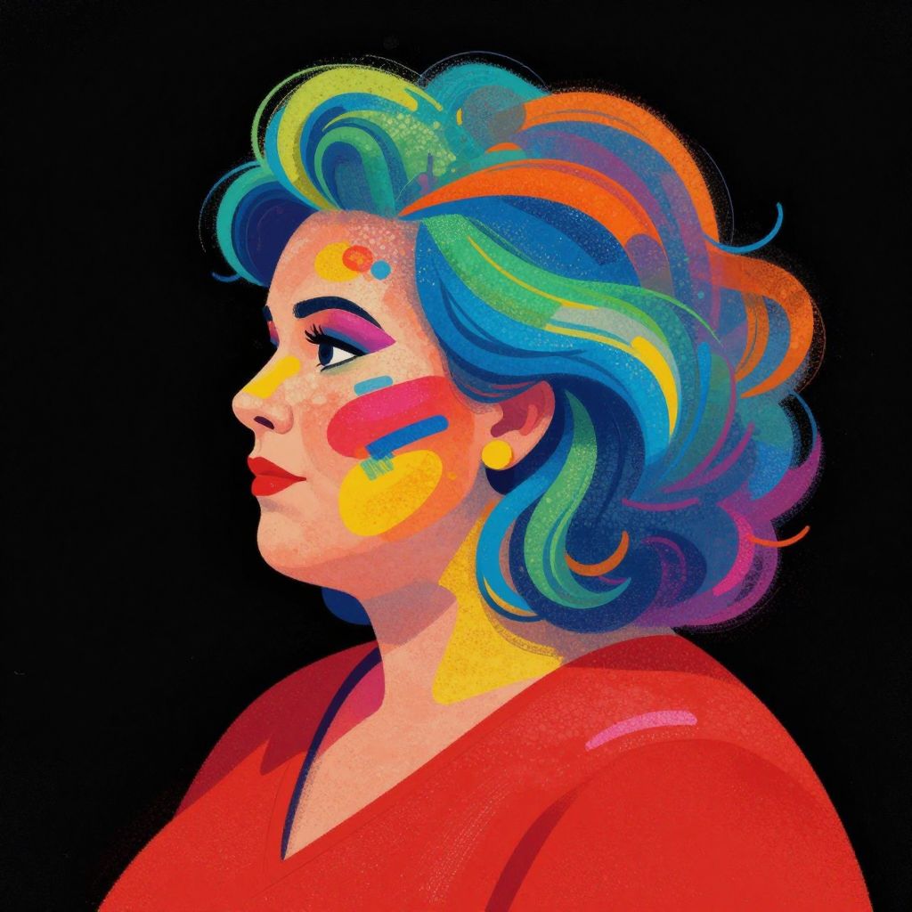A stylized, two-tone illustration of a woman's face with a screen print effect, featuring a flat design and full head and shoulders.