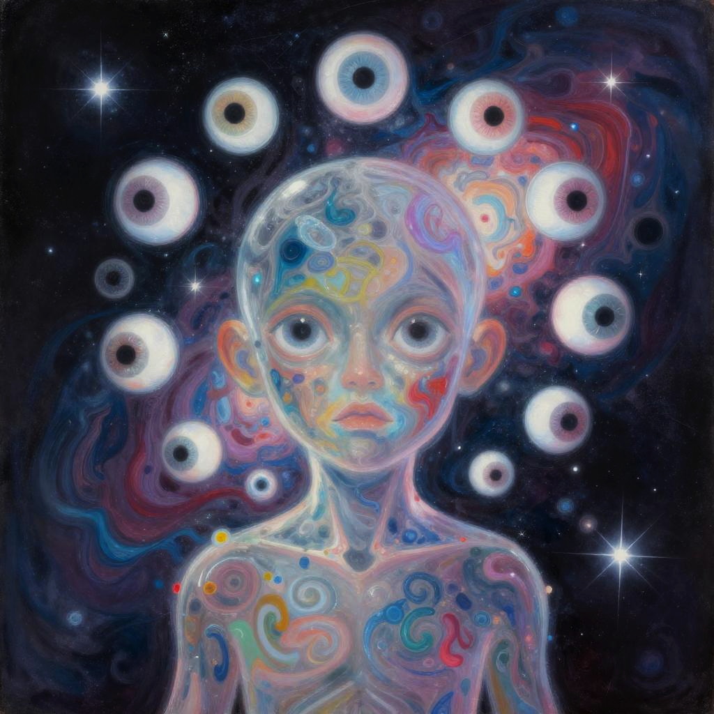 Many eyed monster, surreal nightmare figure with floating eyes orbiting a translucent body, cosmic background with stars and nebulae, abstract art style, vivid colors