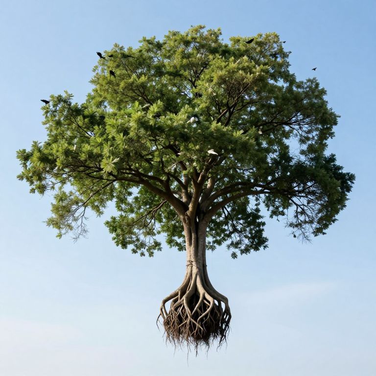 Photograph of a large, lush tree with dense, green foliage against a clear, bright blue sky. The tree's thick, brown trunk and extensive root system are visible, as if the tree is floating in mid-air. The leaves are small and clustered, creating a rounded canopy. The sunlight illuminates the tree, highlighting its vibrant green color and intricate root details. The image has a surreal quality due to the tree's floating appearance. The background is entirely blue, with no other objects or distractions.
