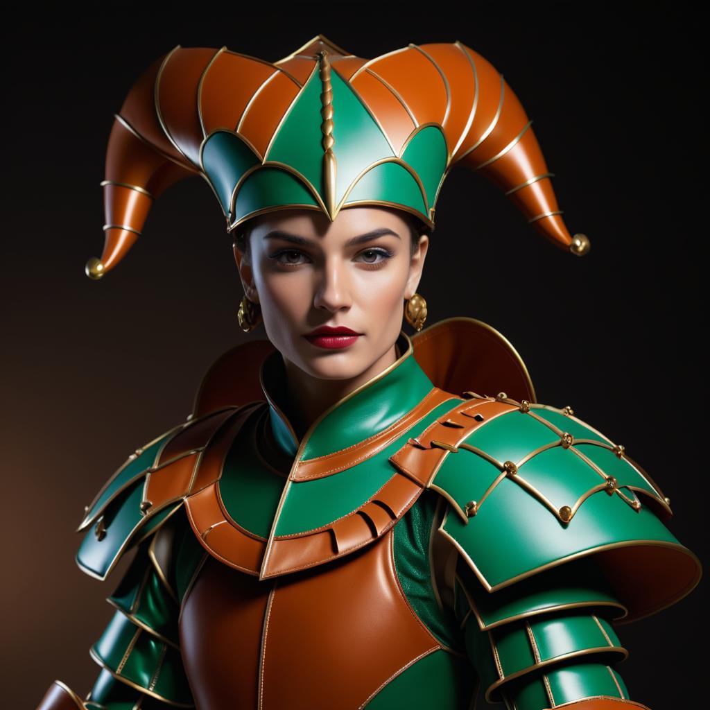 A playful jester model wearing Hermès armor, luxury materials, cinematic and professional studio lighting, sharp focus, 4K.