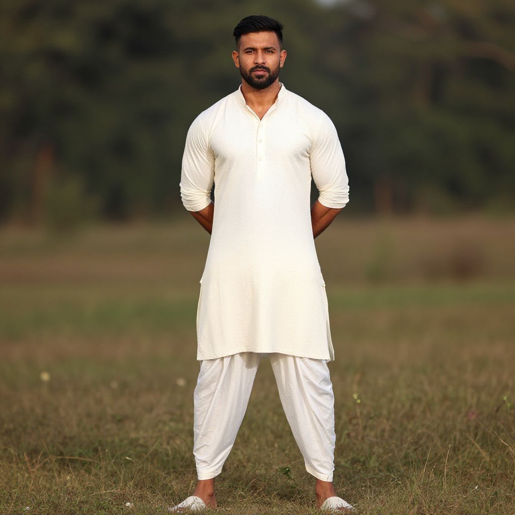 Photograph of a bearded man with medium build, short black hair, wearing a white traditional kurta and pajama, standing confidently in a grass