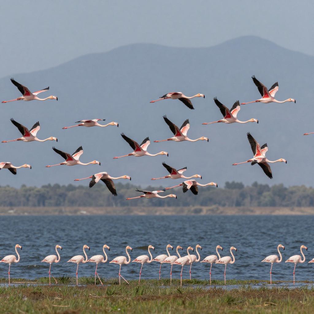 Photograph of a large flock of pink flamingos with black-tipped wings flying over a calm, blue lake. The background features a hazy blue sky and distant mountains. Below, a dense group of flamingos stands on the lake's edge, surrounded by green grass. The image captures the birds in mid-flight, their wings spread wide, creating a dynamic, lively scene.