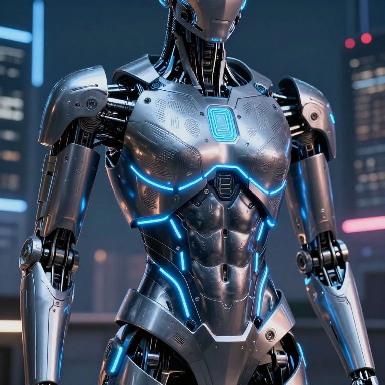 A highly detailed CGI image of a futuristic, humanoid robot with a sleek, metallic silver body. The robot has a muscular, well-defined chest and abdomen, with glowing blue neon lights outlining its contours. It features a futuristic head with a smooth, featureless surface. The background is a blurred cityscape at night, with blue and red neon lights from tall buildings. The robot's joints and segments are intricately designed with visible mechanisms and circuits. The overall style is hyper-realistic and sci-fi, emphasizing advanced technology and modern aesthetics.