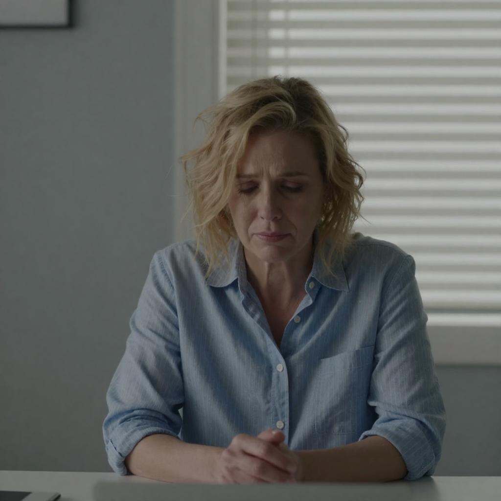 Middle-aged woman with wavy, shoulder-length brown hair, intense expression, black shirt, gold watch, leaning forward, reaching into a grey, white, and green machine. Dimly lit background. Single person.
