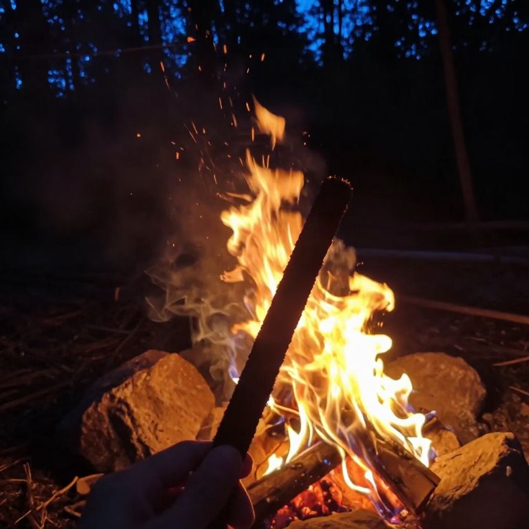 A firestick held by a hand in a nighttime wilderness setting, bright fire illuminating trees and rocks, realistic flames licking the air, subtle smoke trails, moody and atmospheric, photorealistic style