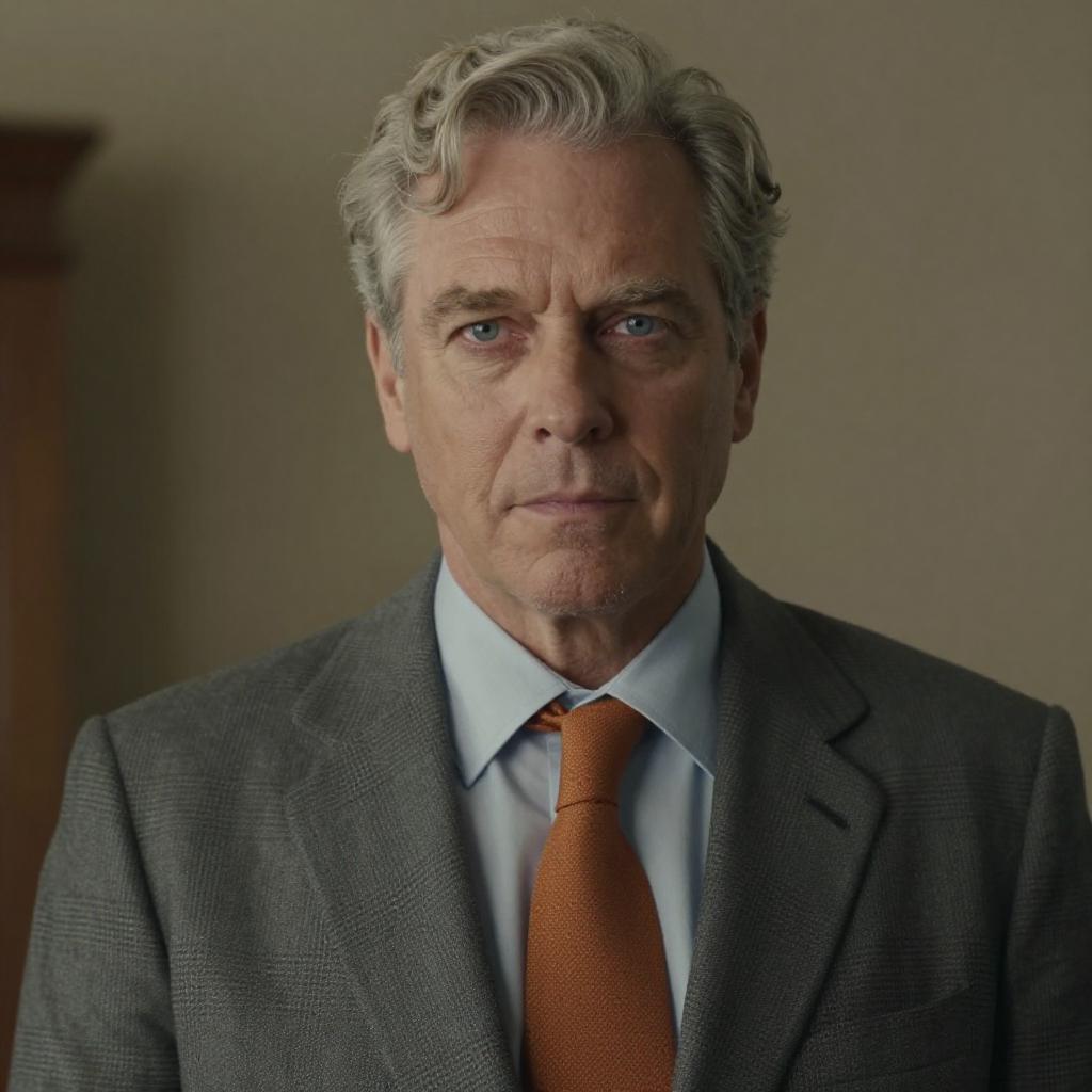 Photograph of an older man with fair skin, blue eyes, and slicked-back brown hair. He wears a green suit with a maroon bow tie and white shirt. Background includes a blurred painting and red wallpaper. He has a serious expression. Indoor setting.
