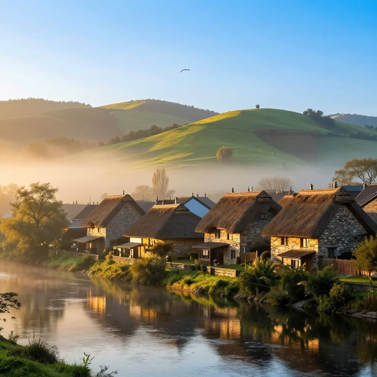 Neam village at sunrise, ancient stone houses with thatched roofs, mist over rolling green hills, a serene river reflecting early morning light, birds flying in the clear blue sky, detailed textures, warm golden tones