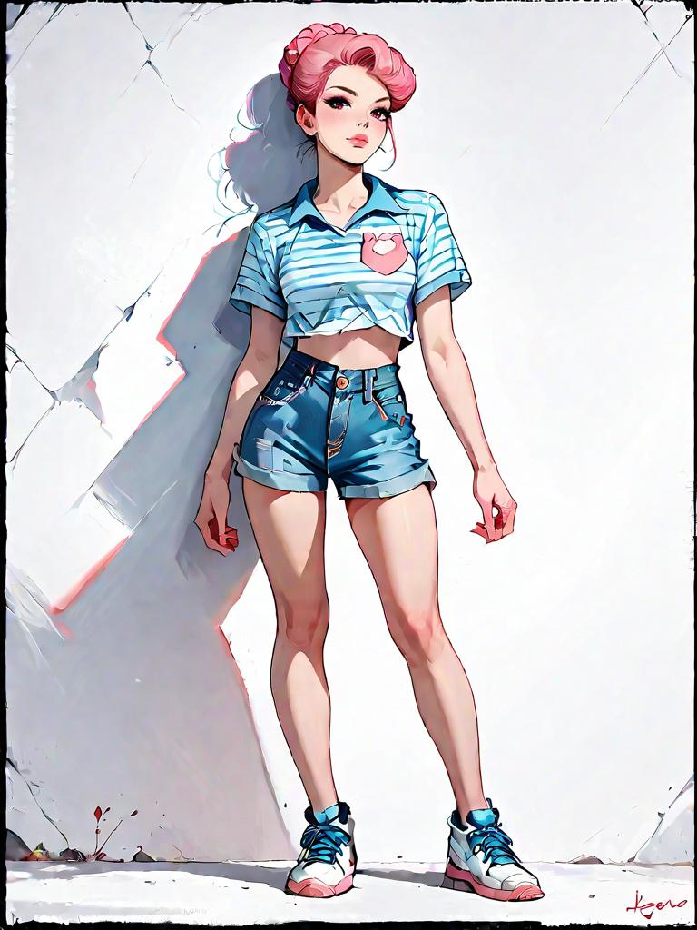 1girl, source_comics, realistic face, full body shot, Woman, casual retro, striped crop top in pink and white, short sleeves, denim dungaree shorts with bib pocket, rolled-up hem, classic white sneakers, hair in a casual bun with bangs, plain indoor wall background.