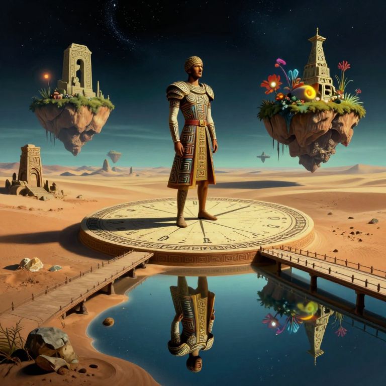 Imagine a surreal dreamscape reminiscent of Salvador Dalí's iconic imagery, set against a vast desert landscape under a mysterious, star-laden sky. A solitary figure, adorned in ornate armor with intricate geometric patterns reminiscent of ancient Mayan craftsmanship, stands atop an immense sundial. As time seems to distort like the soft clocks in Dalí's paintings, the sundial transforms into a bridge linking this world to another realm of floating islands covered in enigmatic ruins and glowing flora. The figure's reflection on the mirrored surface beneath the bridge reveals a dual existence, blurring the lines between reality and dreamscape. This captivating scene is illuminated by an enchanting blend of natural and otherworldly light sources, casting playful shadows that dance across the ground and evoking a sense of wonder and intrigue.